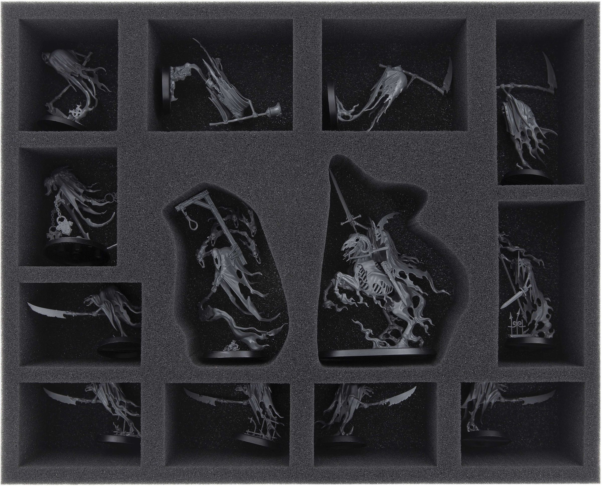 Two foam trays provide a safe place for the ghost miniatures aside the battlefields. All miniatures are arranged here in custom-made compartments. Completely surrounded by soft foam, sensitive parts such as the Guardian of Souls' nightmare lantern or cloak shreds are optimally protected. Vexingly bending is prevented and also the colors of painted miniatures will not flake off. A foam topper on the upper tray provides final protection of the figures to the top.