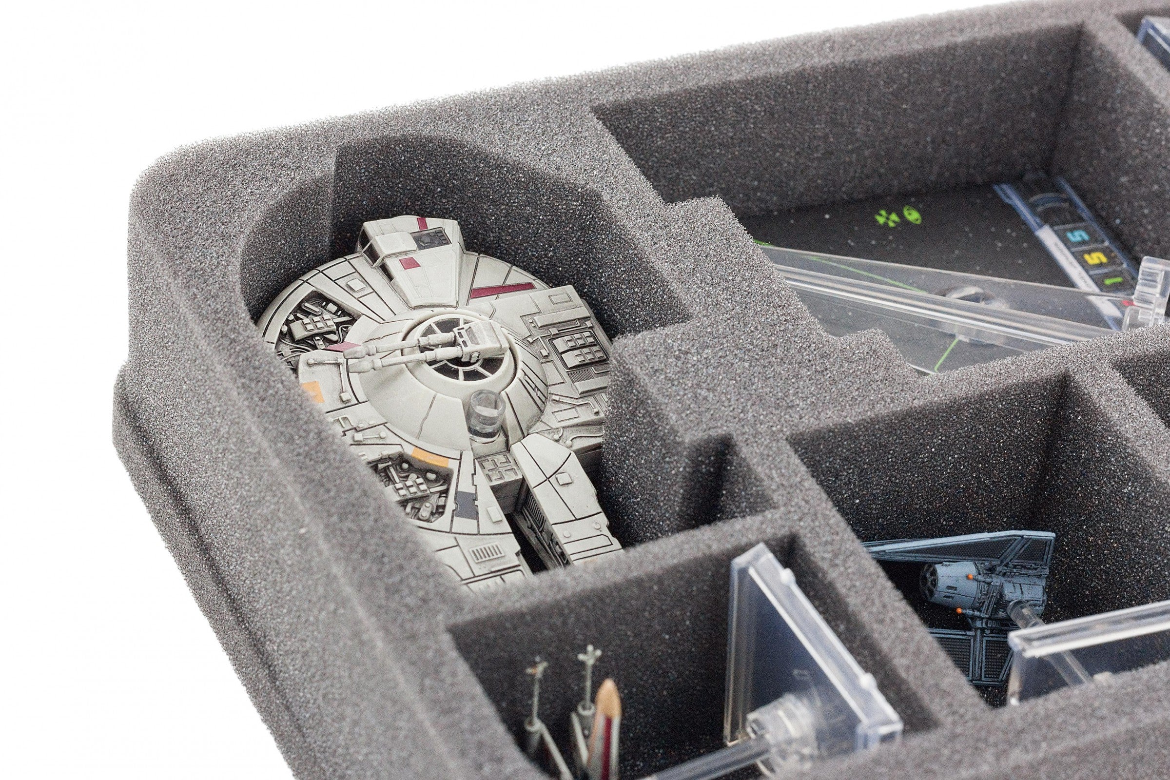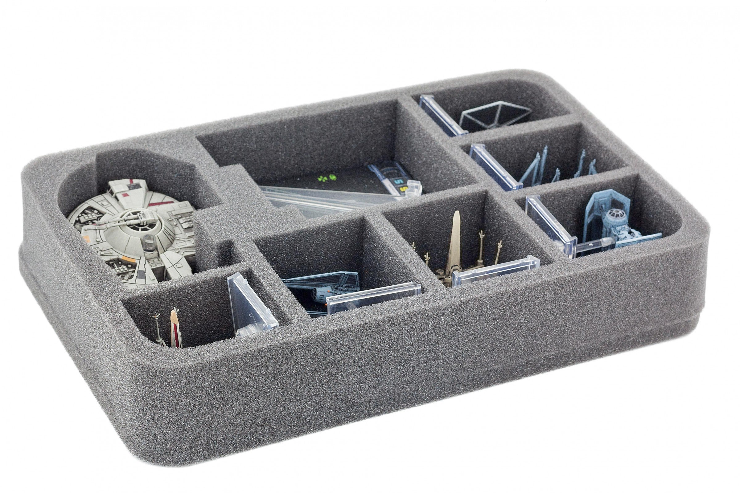 Especially for the Star Wars X-WING YT-2400 Freighter tailored foam tray. In this contribution not only to the YT-2400 Freighter takes place safely, but also the accessories, such as bases, tokens, stand and there is still room for X-Wing space ships like the HWK-290, Tie Fighter, Clone Z-95 Headhunter and others.