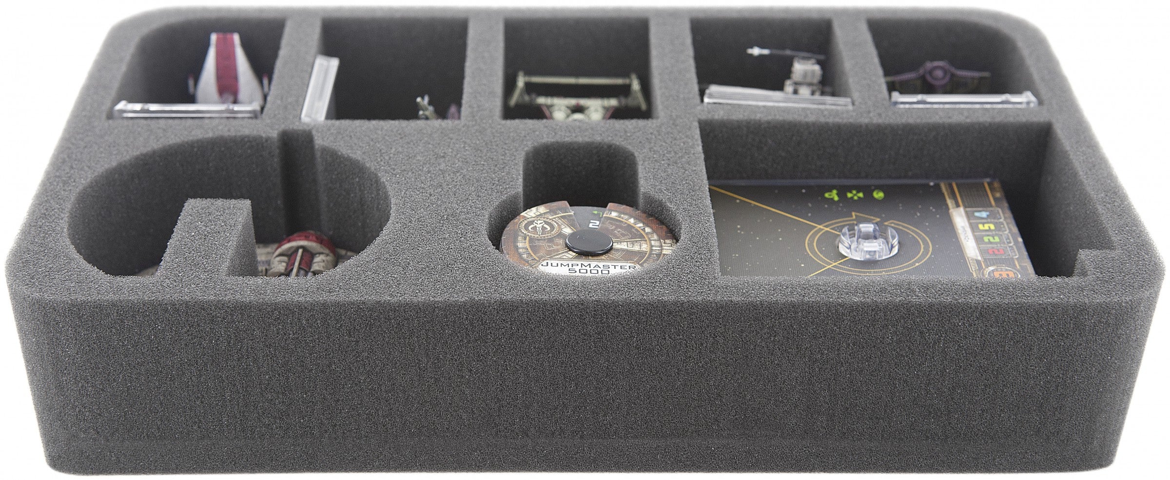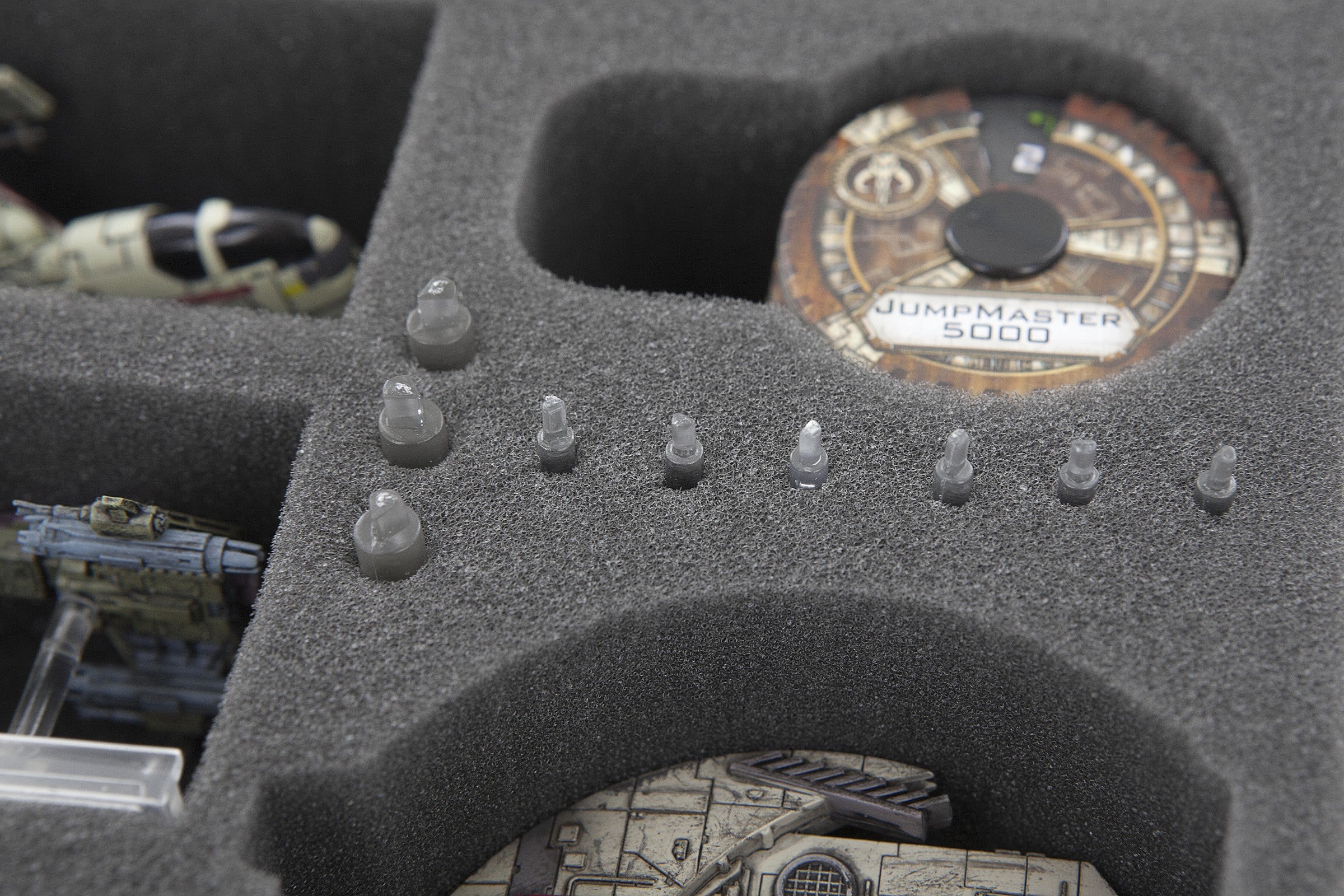 Especially for the Star Wars X-Wing Punishing One made foam tray. In this inlay find a JumpMaster 5000 safe place. In addition still fit up to five Fighters in the foam tray. Of course, the foam tray offers even space for accessories. The base stand can be sunk in the designated cross slots.