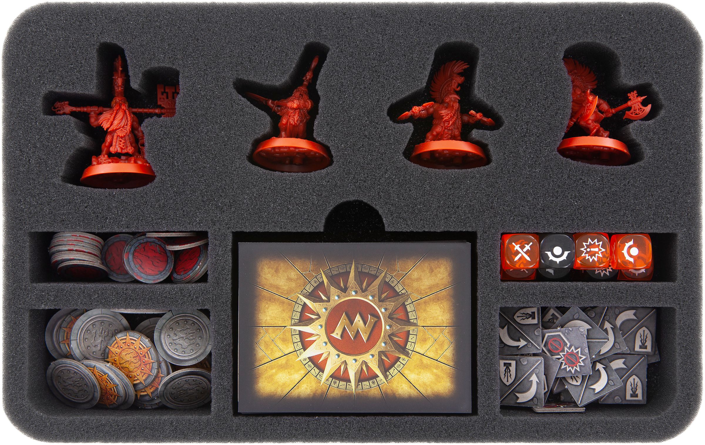 With the warband of The Chosen Axes for Warhammer Underworlds: Shadespire, your collection is expanded by four more miniatures, plus the corresponding deck of cards and six dice. So that Fjul-Grimnir and his men are all safely and orderly stored, we have designed the practical Magnetic Box containing a foam tray, plus matching foam topper.