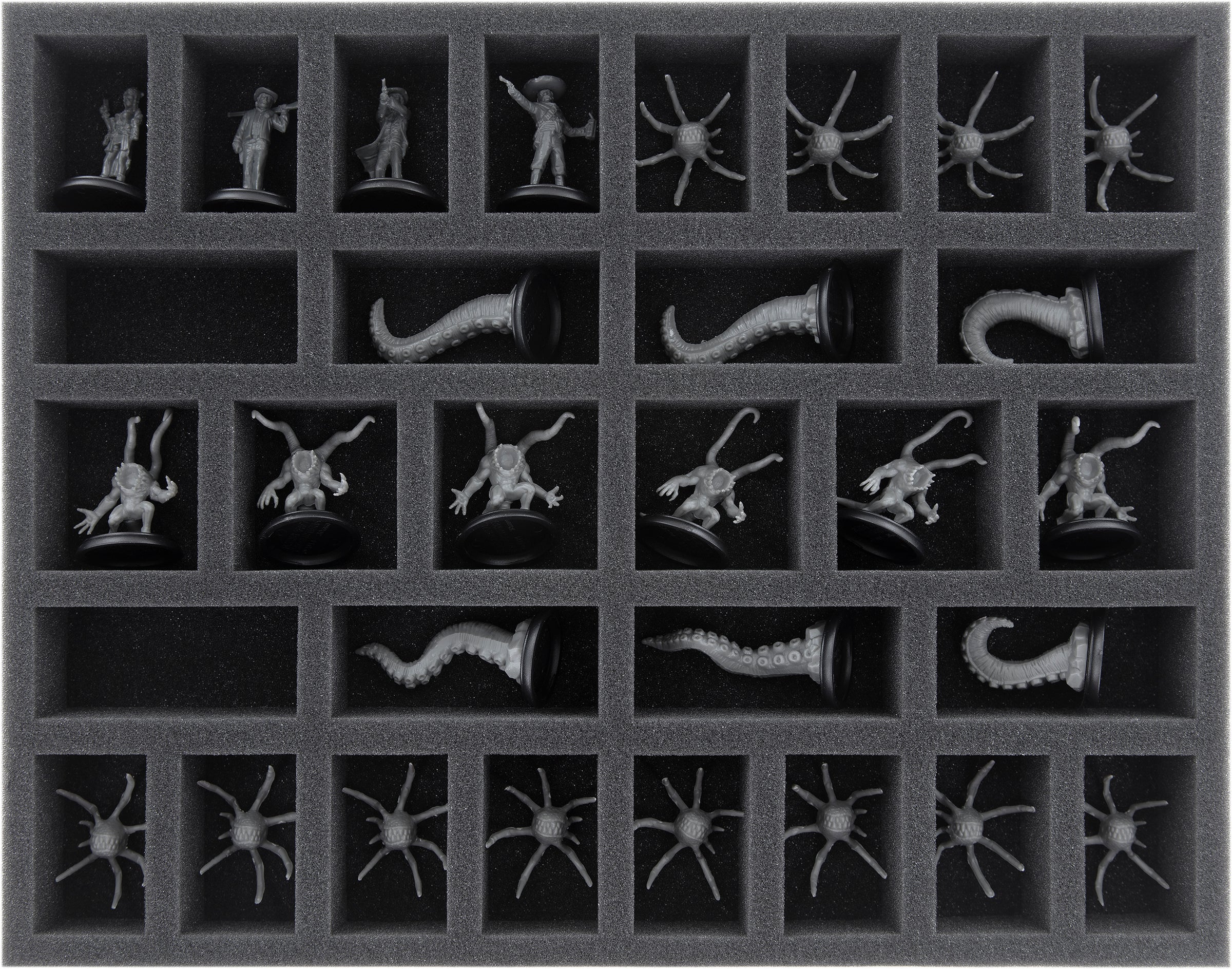 For tidy and safe storage of miniatures and accessories, the set contains a total of six foam inserts. Each figure is assigned its own custom-fit compartment. This prevents them from slipping around and bumping into each other during transport. The soft foam material protects the tentacles just as well as the weapons of your heroes from damage. Colors of painted figures are also reliably protected from scratches or abrasion.