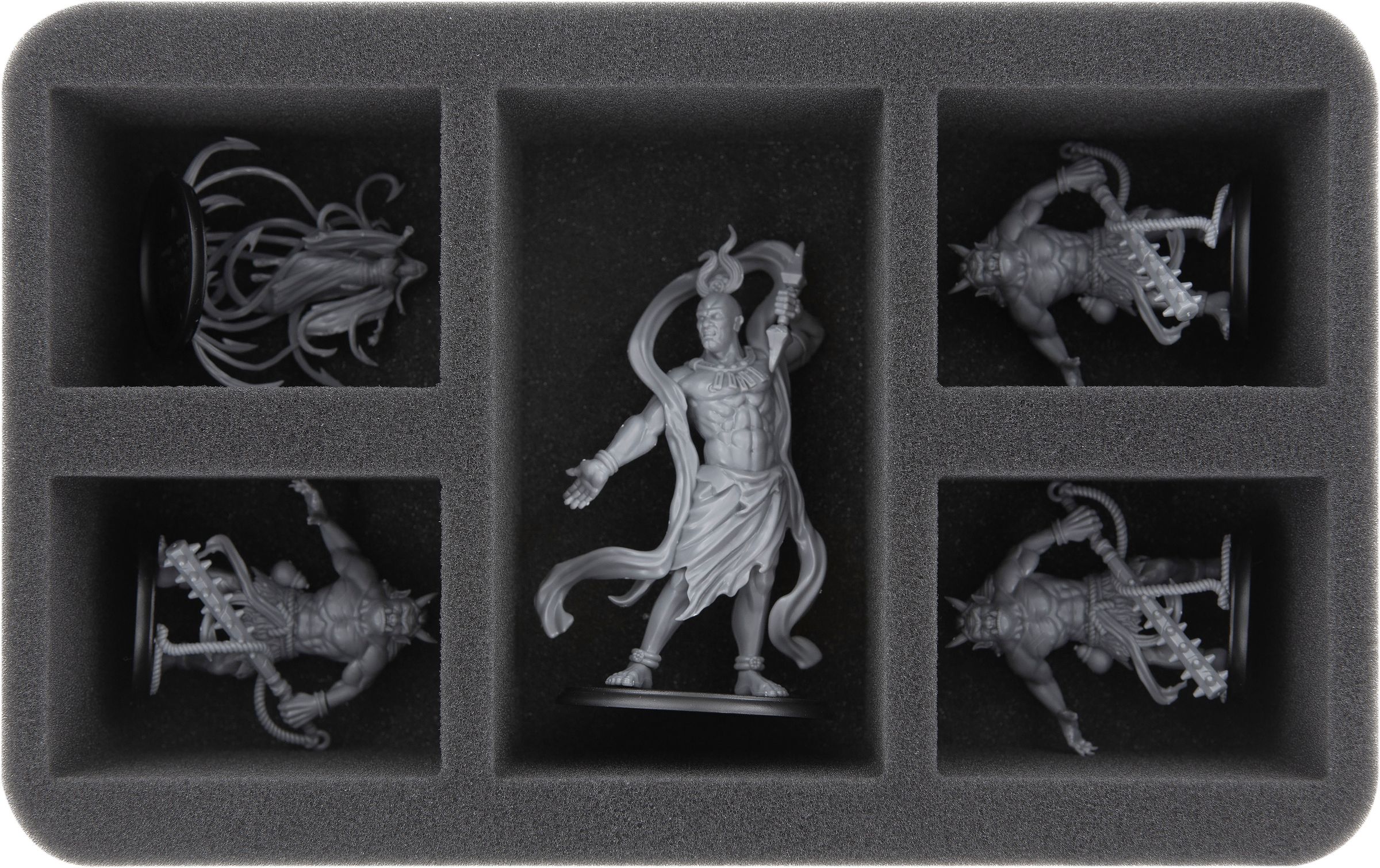 This foam tray has 5 compartments for the safe and orderly storage of large and medium-sized "Shadows of Brimstone" miniatures. The fine-pored foam provides reliable protection against damage – delicate parts stay intact, the color of painted models remains unharmed.