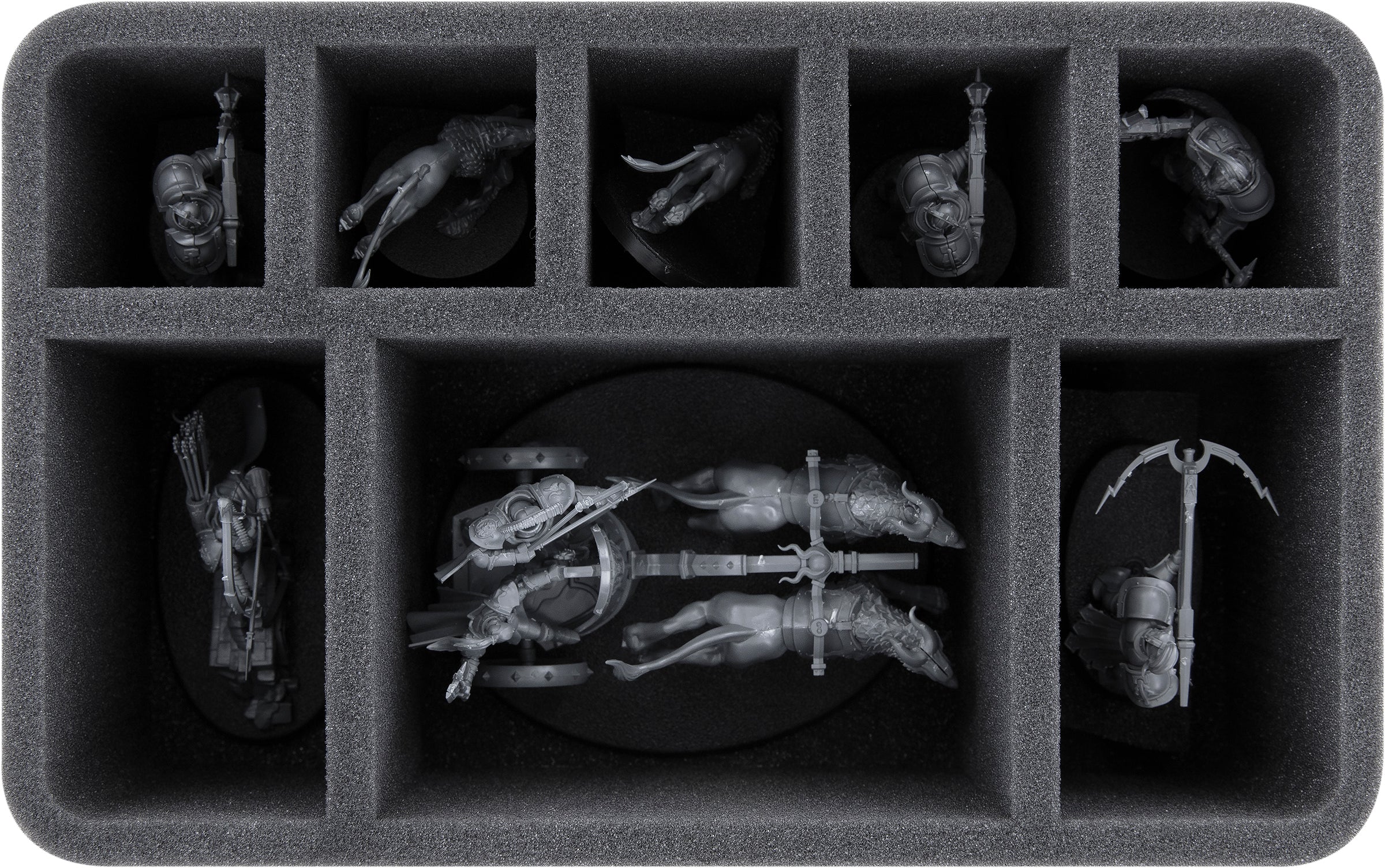 - 1 Half-Size foam tray with eight compartments for large miniatures like Eternus, Gorebeast Chariot, Chaos Lord on Demonic Mount, Centaurion Marshal, or miniatures with similar dimensions (HS095A002)