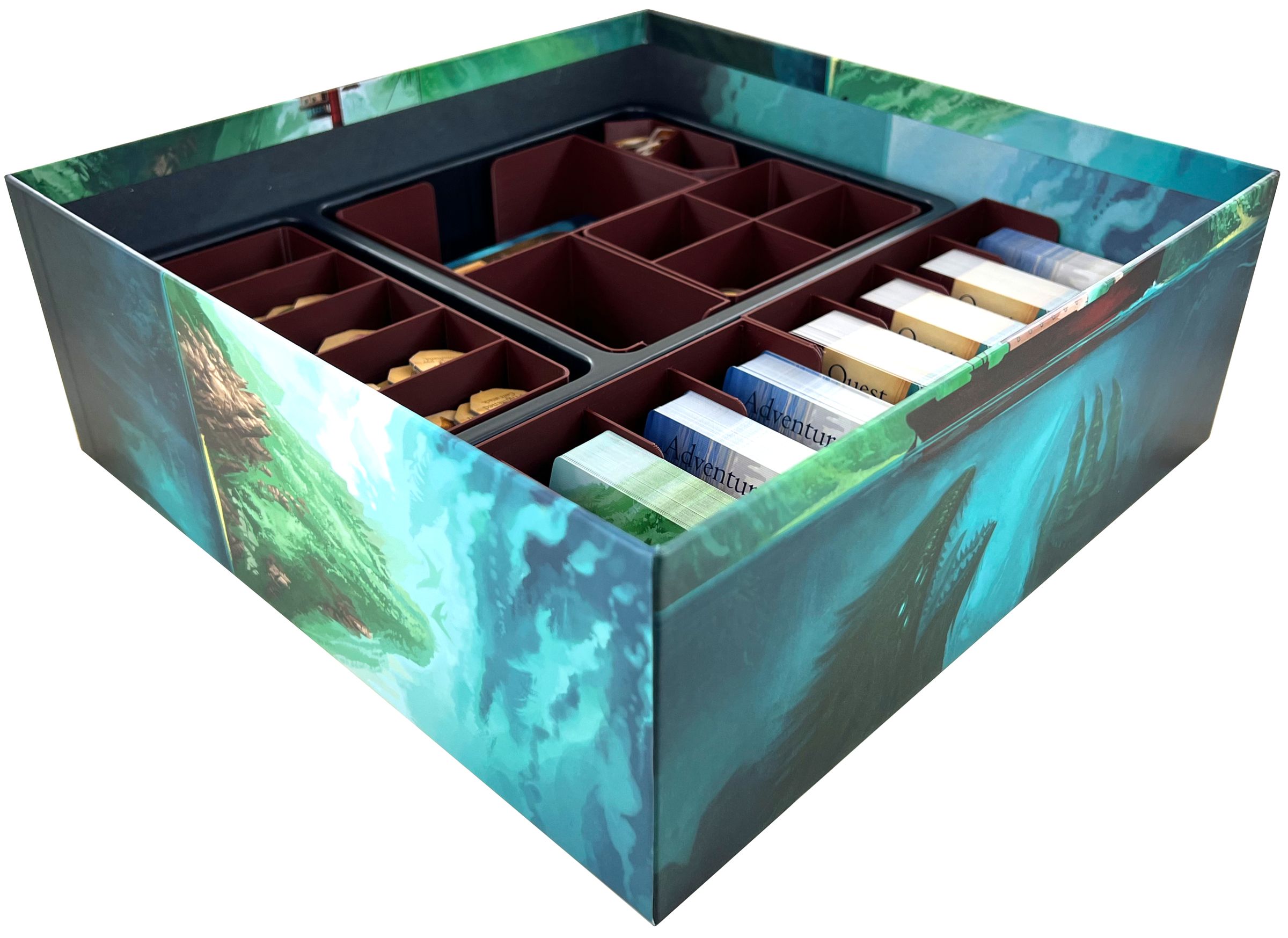 • 2 plastic card holders, each with four compartments for normal cards like Adventure Cards, Market Cards, Quest Cards, and Event Cards