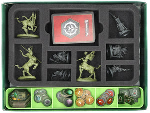 The term "Spitewood" cannot be clearly assigned to a specific game. It is probably a fantasy board game, a skirmish miniatures game or a role-playing game setting with lots of cards, markers and possibly minis. Specialized storage solutions help to keep all "Spitewood" components safe, sorted and ready for transport.