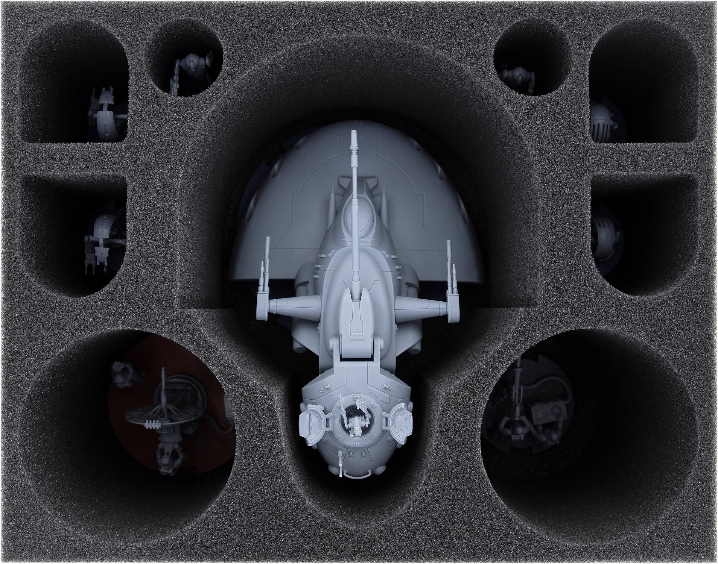The large compartment in the middle is tailored to one model of the AAT Trade Federation Battle Tank including base. Thanks to the precisely fitting cut, the miniature remains securely in place even during transport. The soft foam material reliably protects the laser cannons, antennas and the droid in the turret from damage. And of course, the colors of the painted miniature are also preserved from scratches and abrasion.