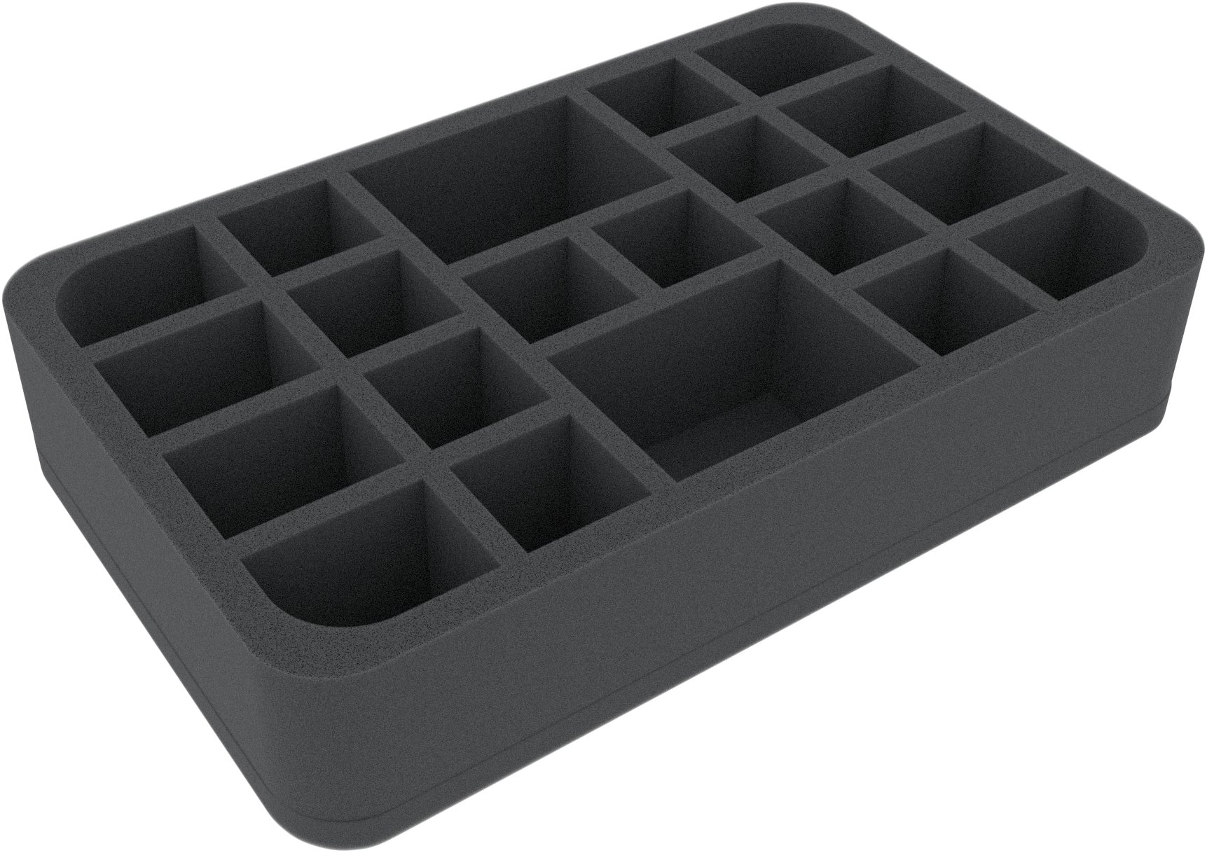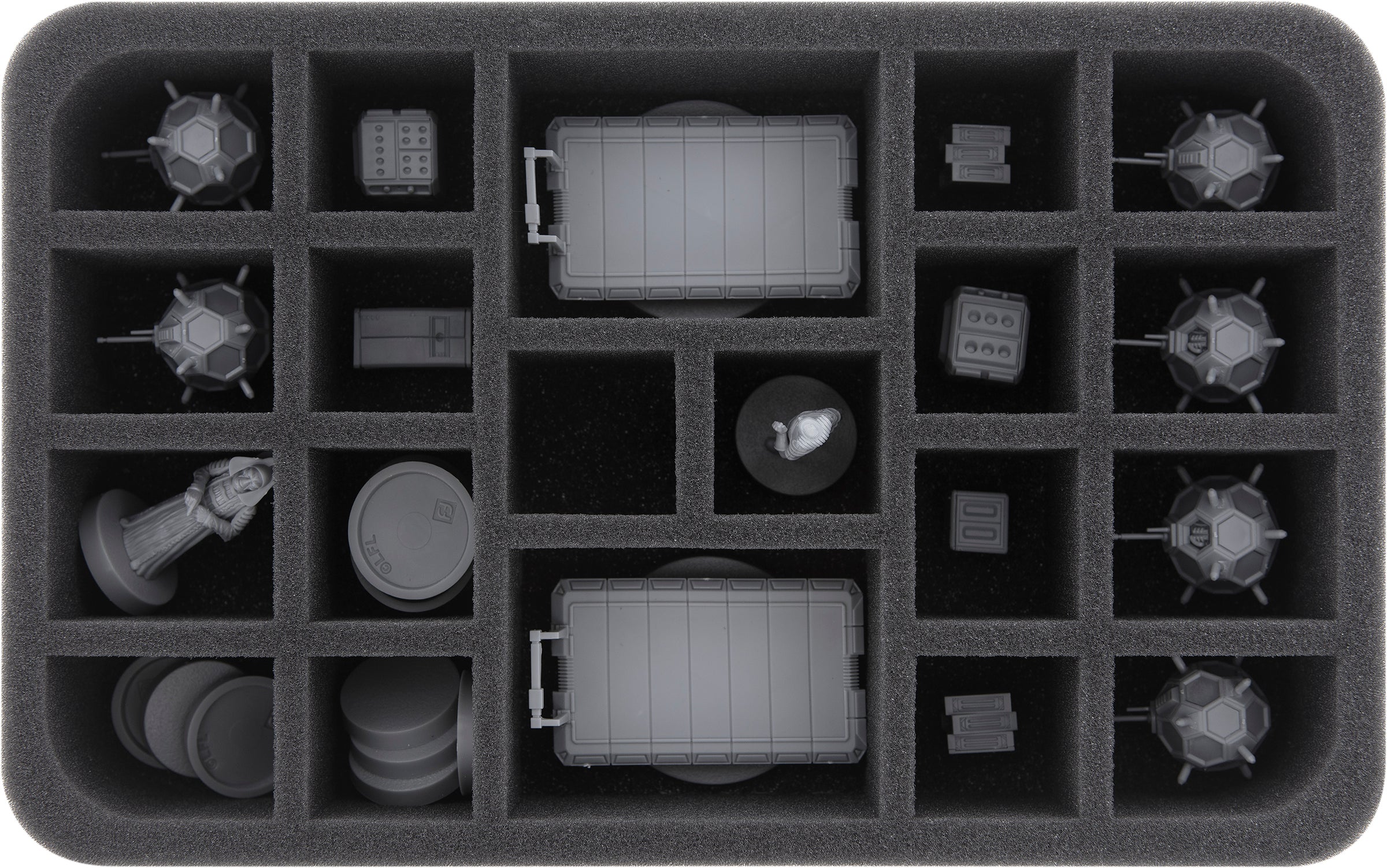 With this Half-Size foam tray you can keep all 16 miniatures from the Star Wars: Legion Battlefield Expansion "Vital Assets" safe and tidy. All miniatures can be stored with or without Base.