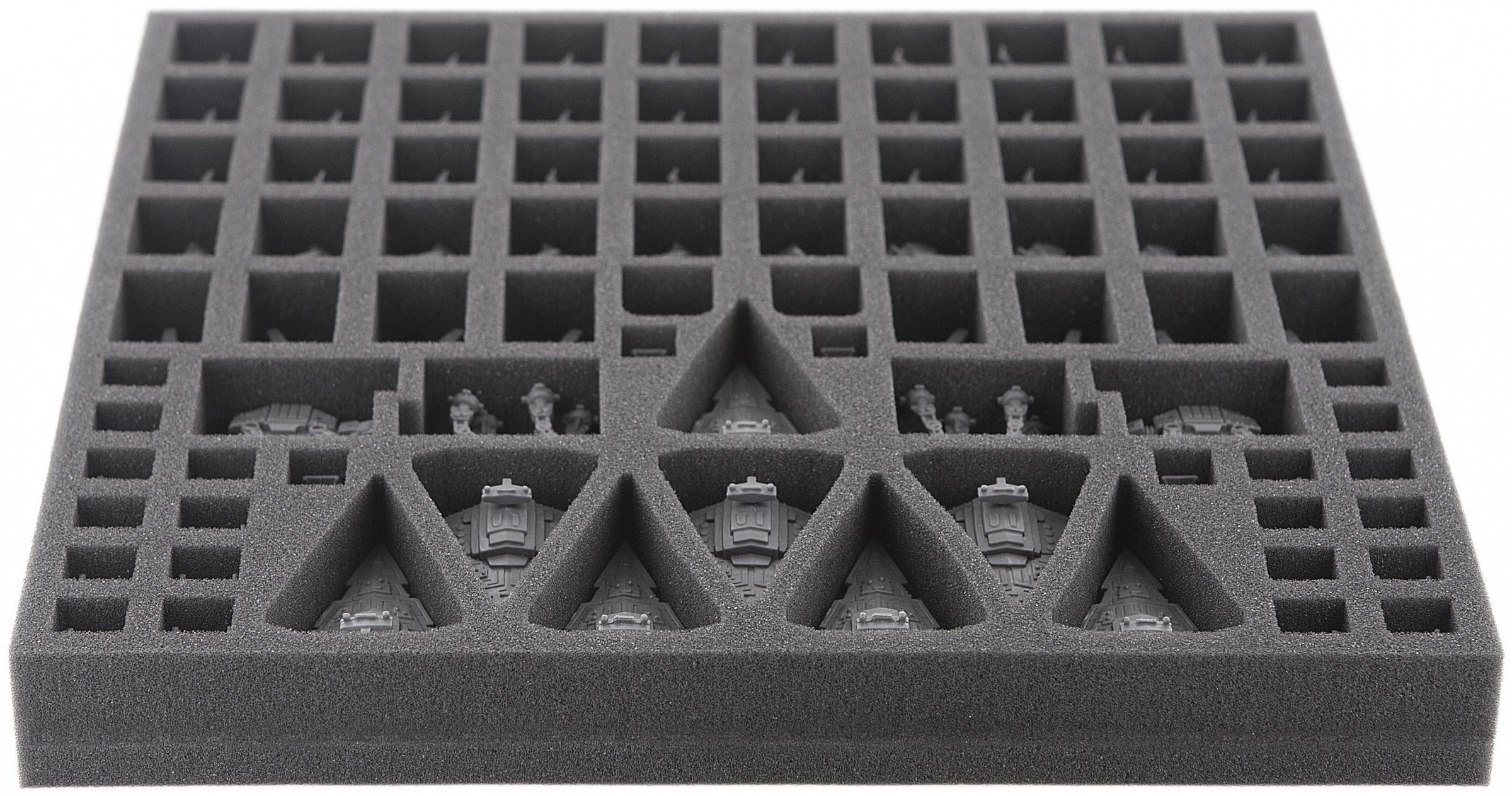 Foam tray especially for Star Wars Rebellion. The 86 different sized compartments are for 8 Star Destroyers, 4 AT-AT Walkers, 8 Assault Carriers, 10 AT-ST Scout Walkers, 30 Storm Troopers and 24 TIE Fighters.