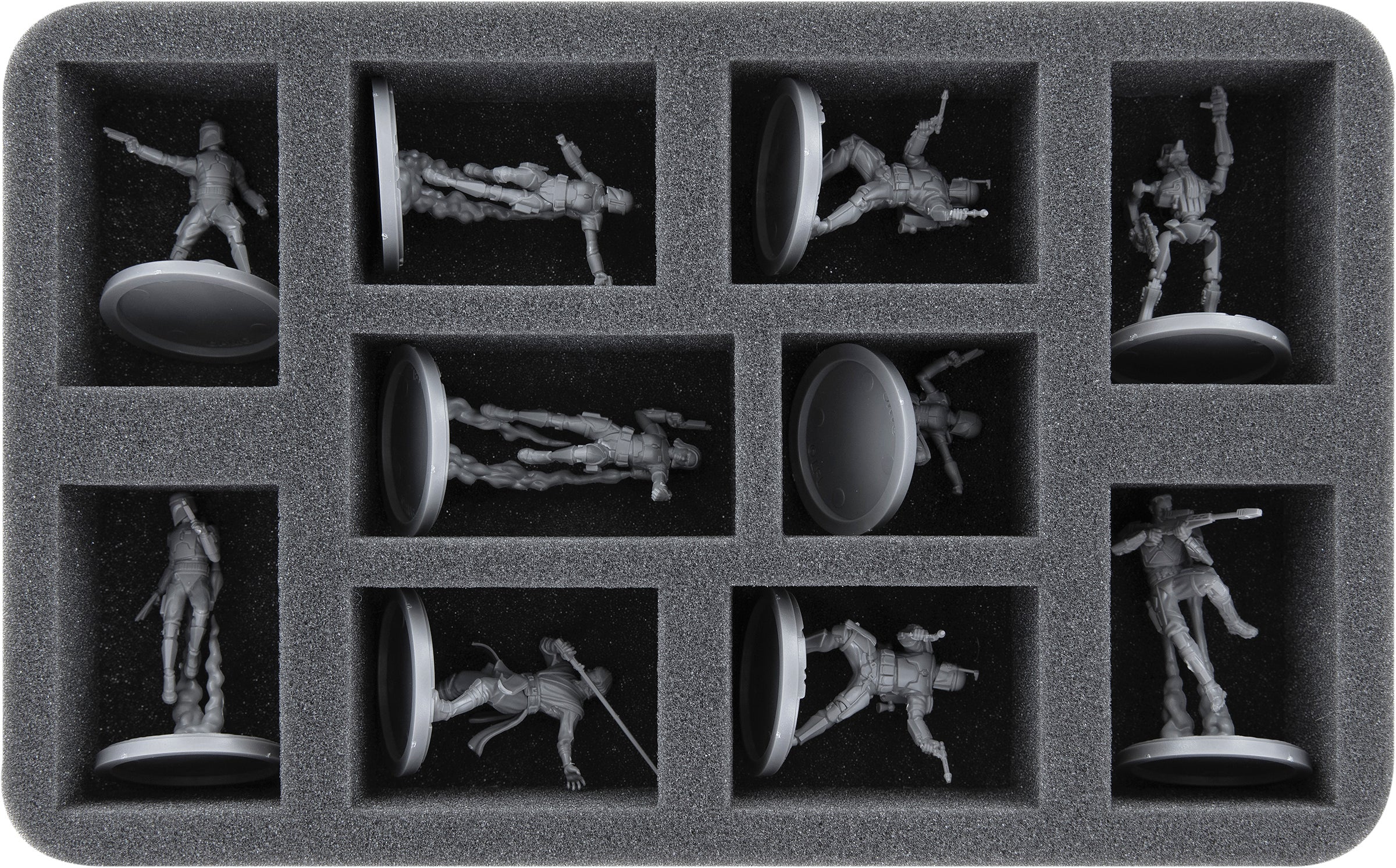 - 1 Half-Size foam tray with ten compartments for bulky models on 40 mm bases like Anakin Skywalker, Bo-Katan Kryze, Mandalorians, and miniatures with similar dimensions (HS050A134)