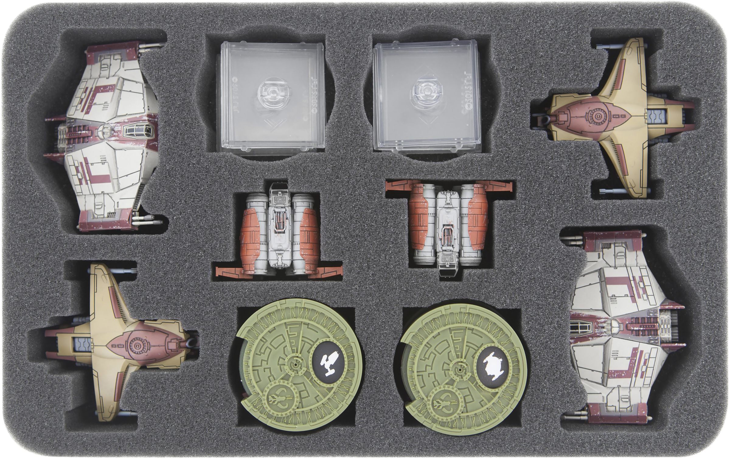 With this foam tray you can protect your Scum fleet of M12-L Kimogila Fighter, Quadjumper and H-6 Scurrg Bomber. For each ship you have two compartments with a special designed shape. So your ships fit in the foam perfectly. In the foam tray you have additional space for six Dials and six Bases.