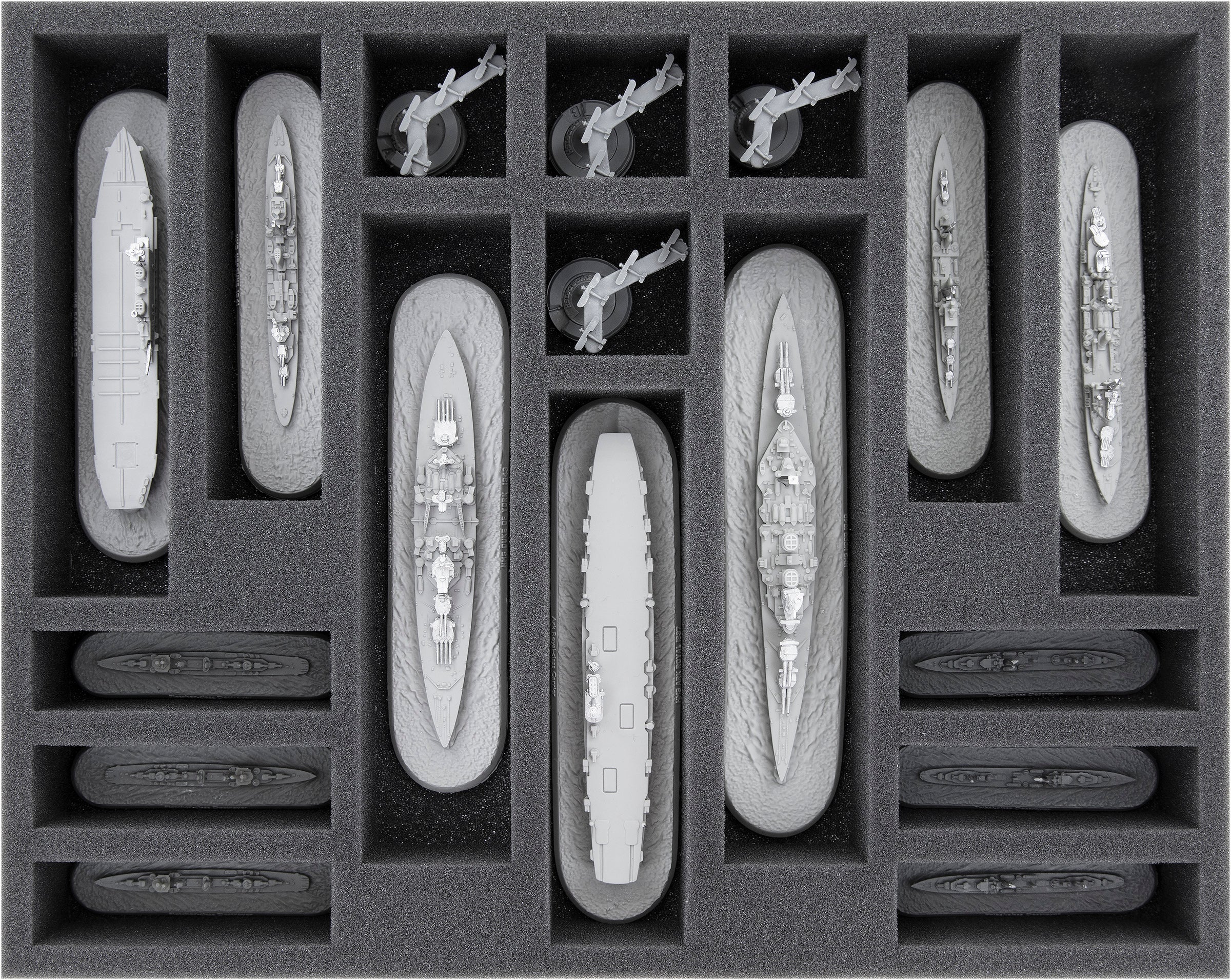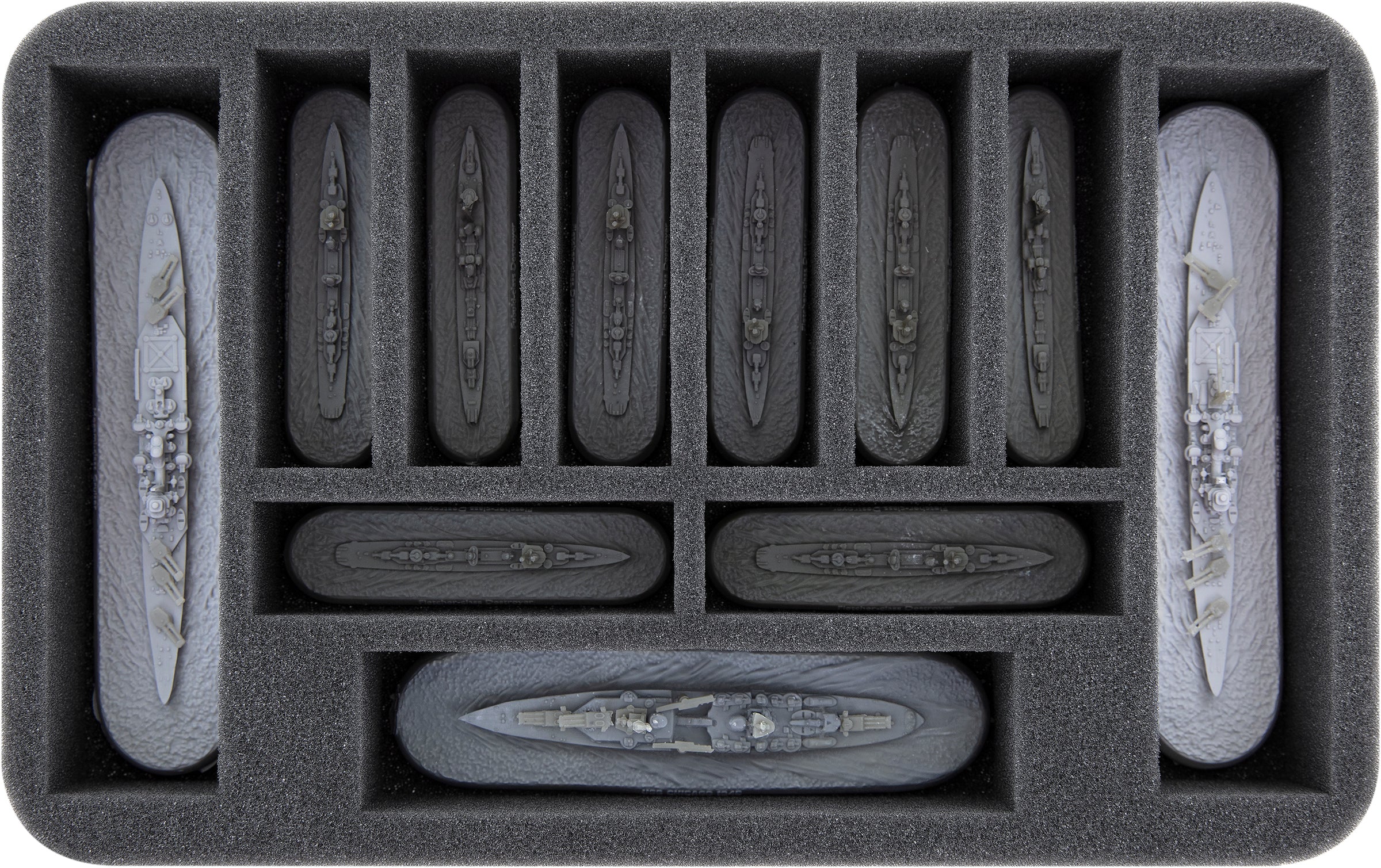 • 2 Half-Size foam trays each for 11 miniatures e.g. smaller Fubuki or Fletcher-class Destroyers or larger ships such as the USS Indianapolis or Kumano 1944 (HS045A011)