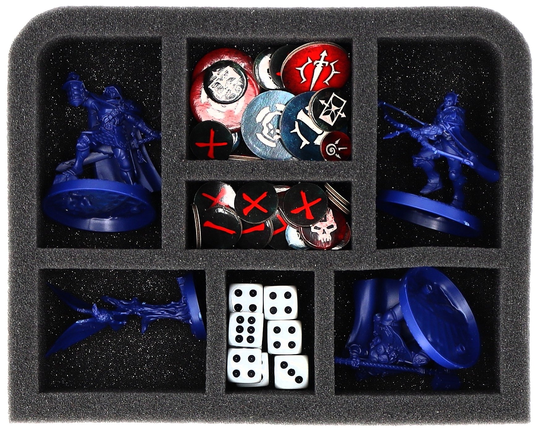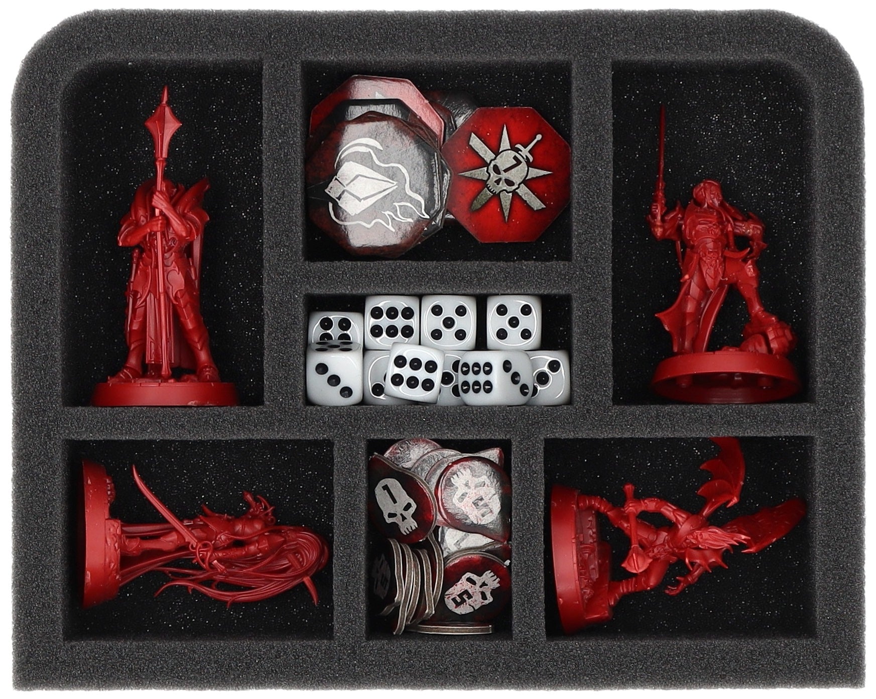 • 2 Quarter-Size foam tray with 7 compartments for warbands such as the Xandire’s Truthseekers, the Crimson Court and models with similar dimensions (QSMFKR050BO)