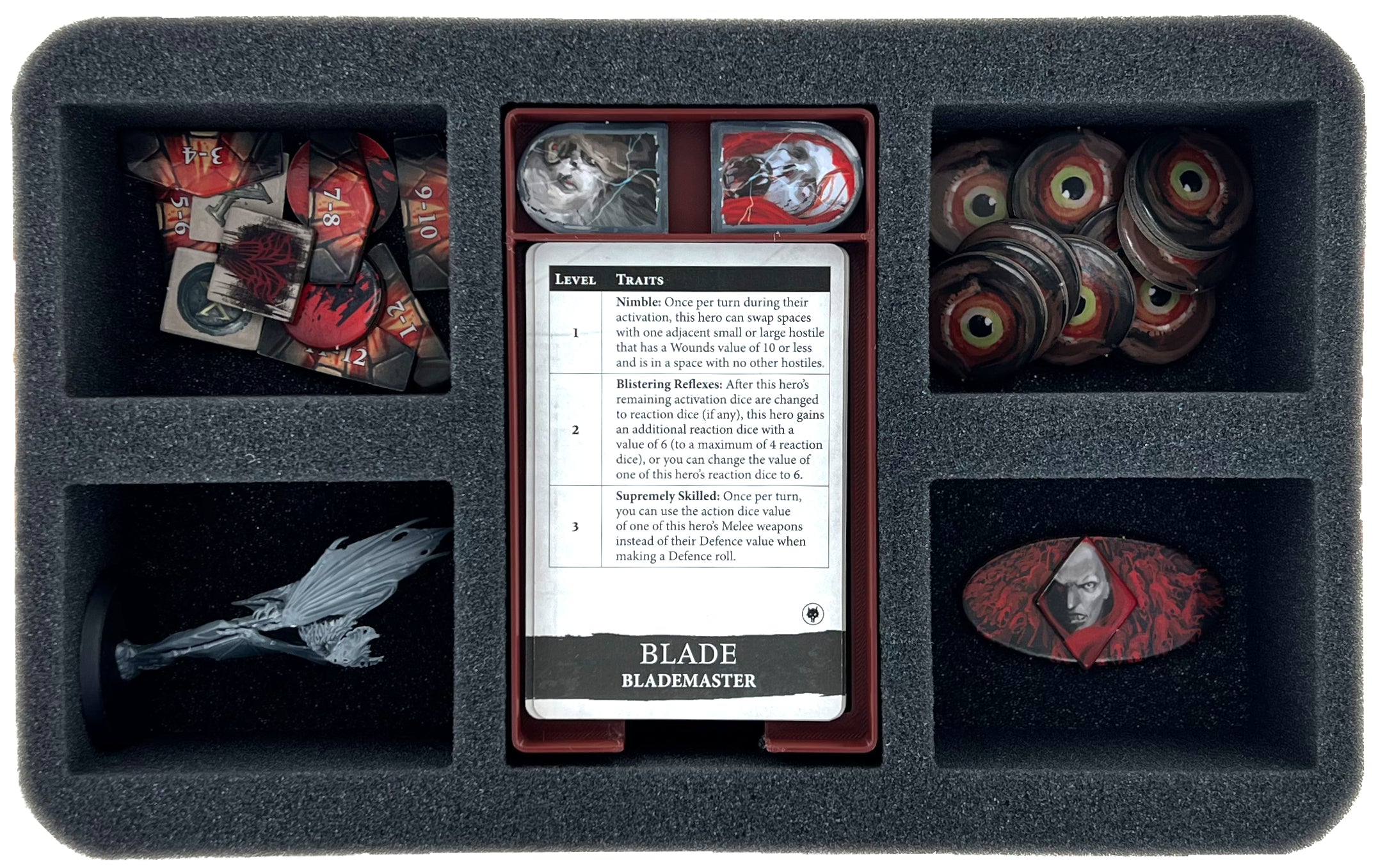 - 1 Half-Size foam tray with six compartments for miniatures like Radukar the Beast, Lady Annika, Kritza, Carmilla DuSang, and Fell Bats