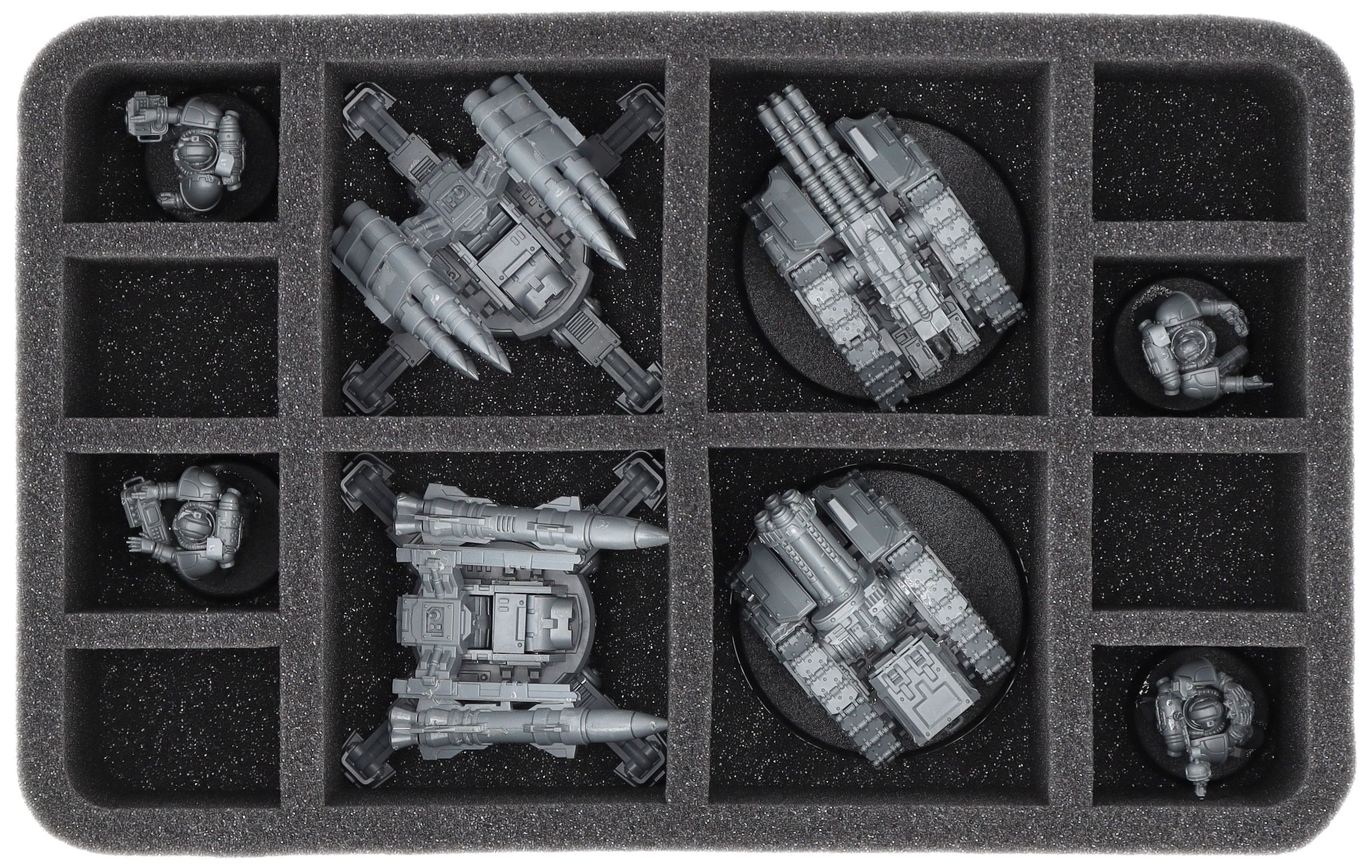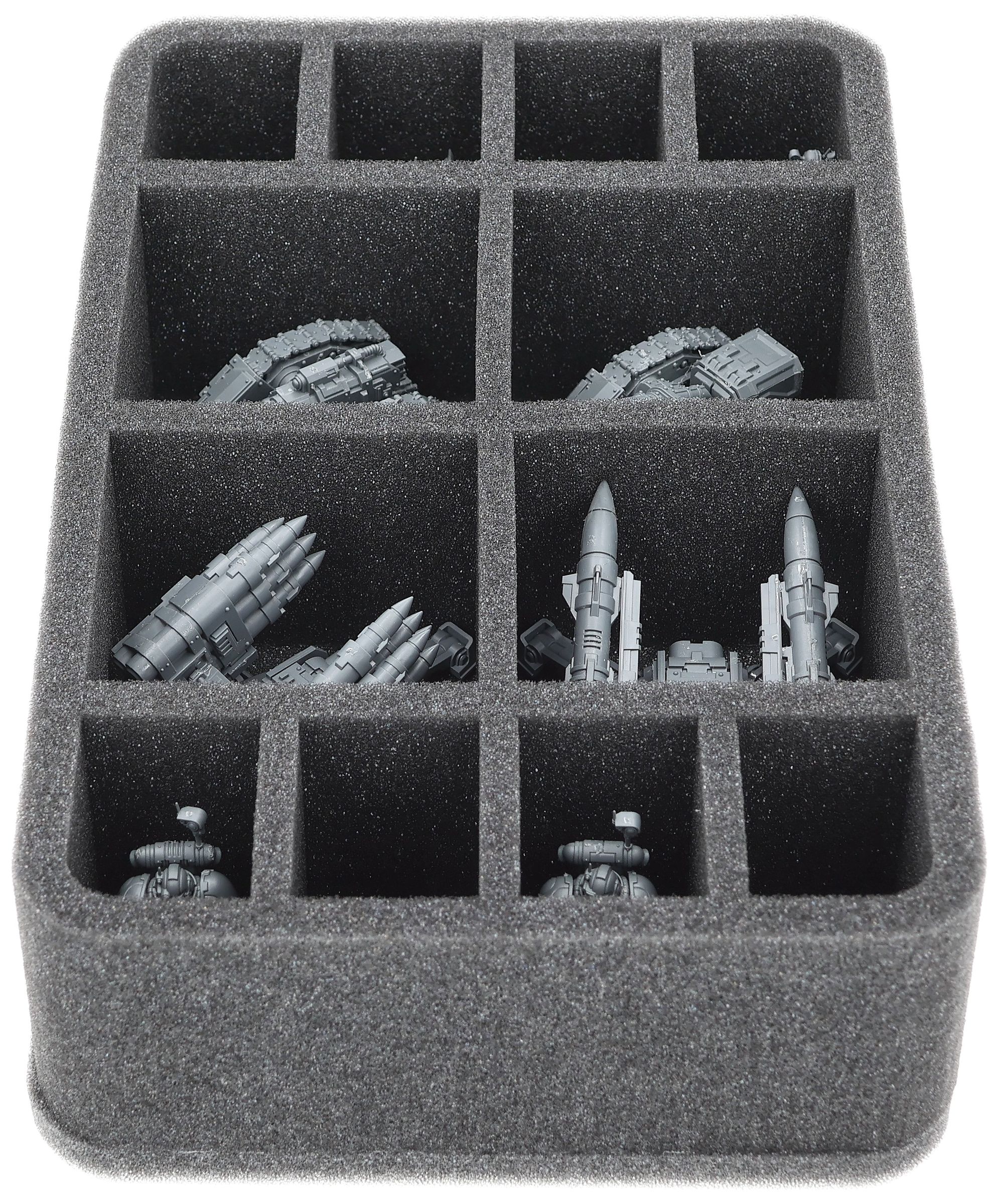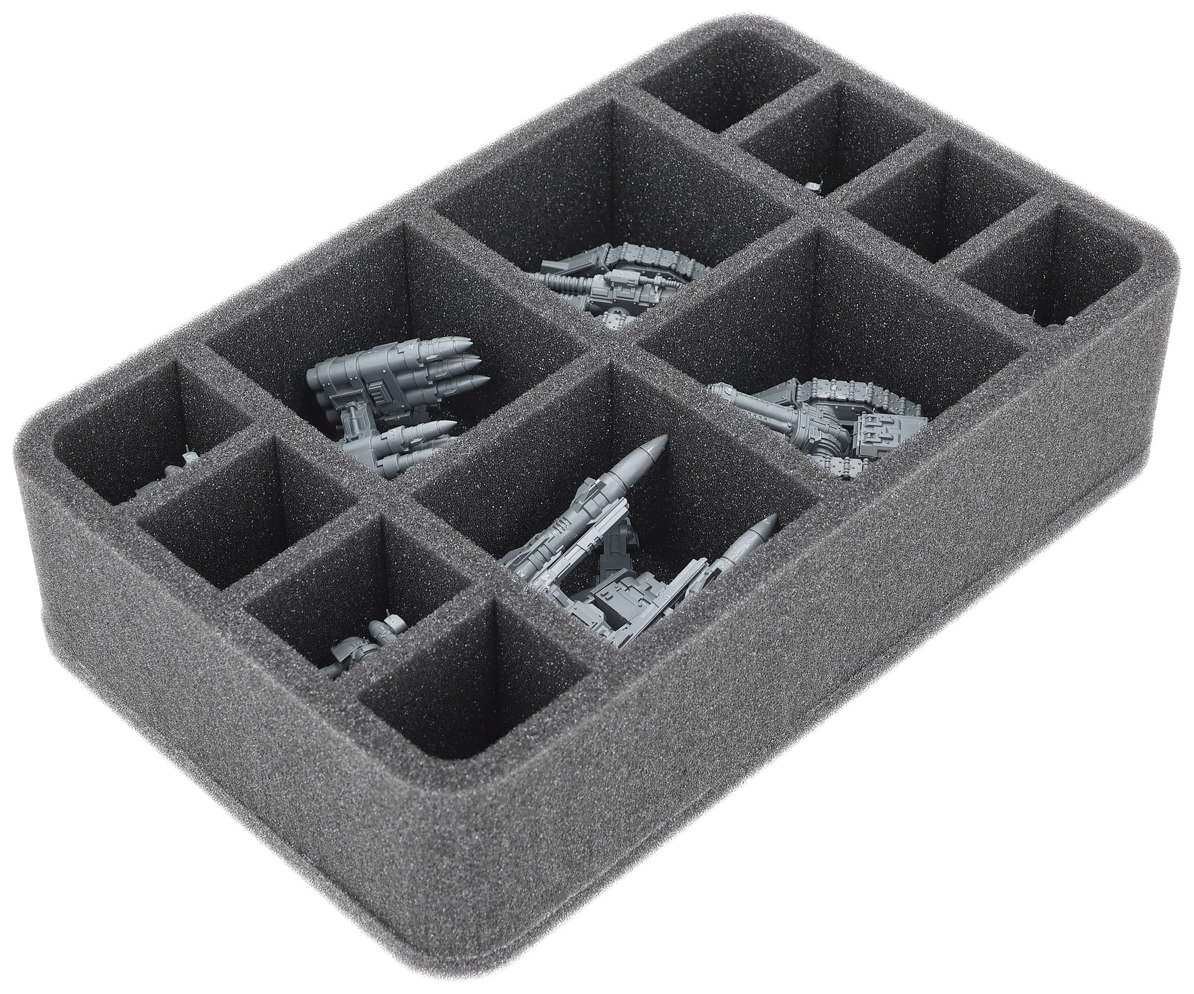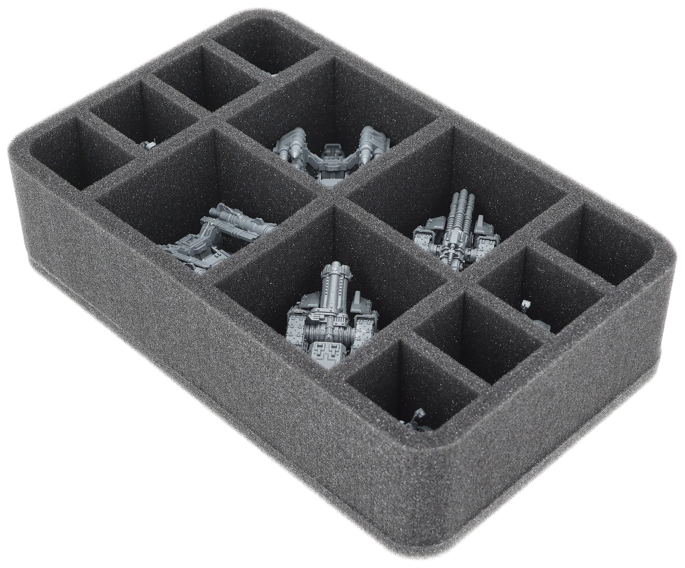 On this Feldherr foam tray you have space for up to 12 miniatures of your Horus Heresy army. The insert is especially suitable for storing the Tarantula Sentry Guns, Tarantula Missile Battery, Rapier Quad Heavy Bolters and Graviton Cannon Battery, Rapier Laser Destroyer and Quad Launcher Battery and similar sized models.