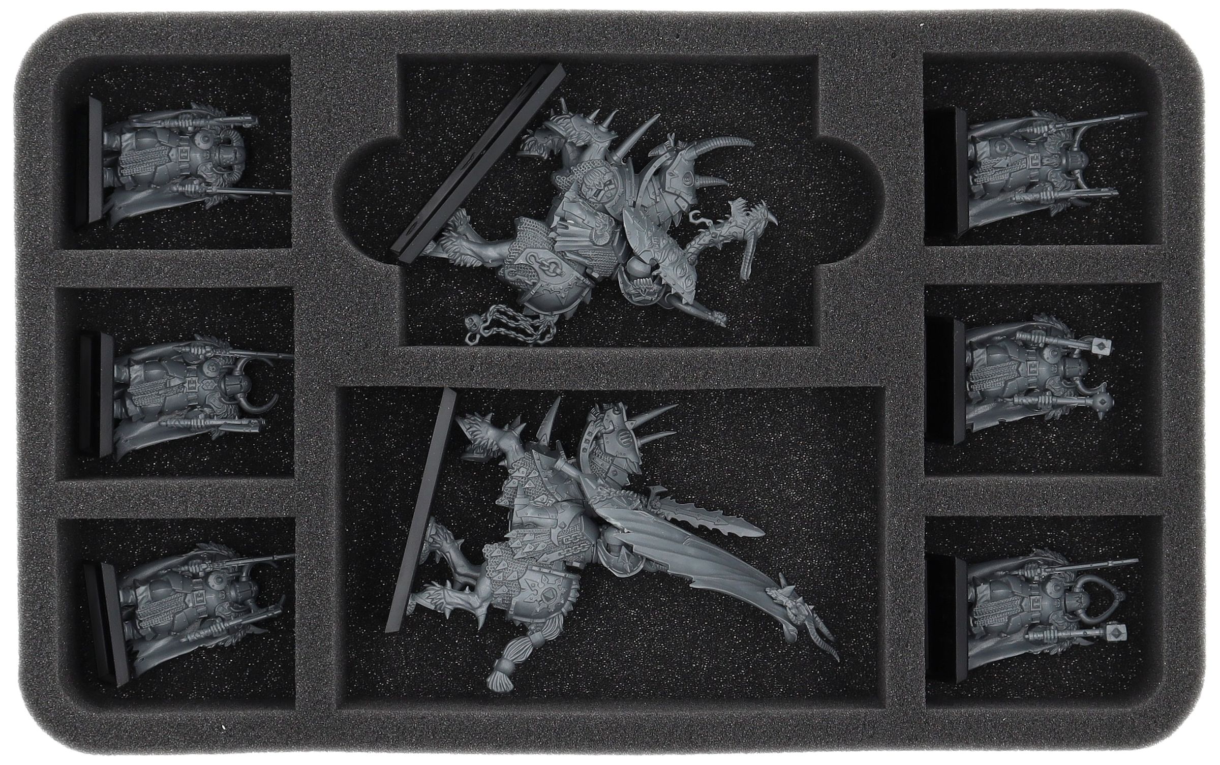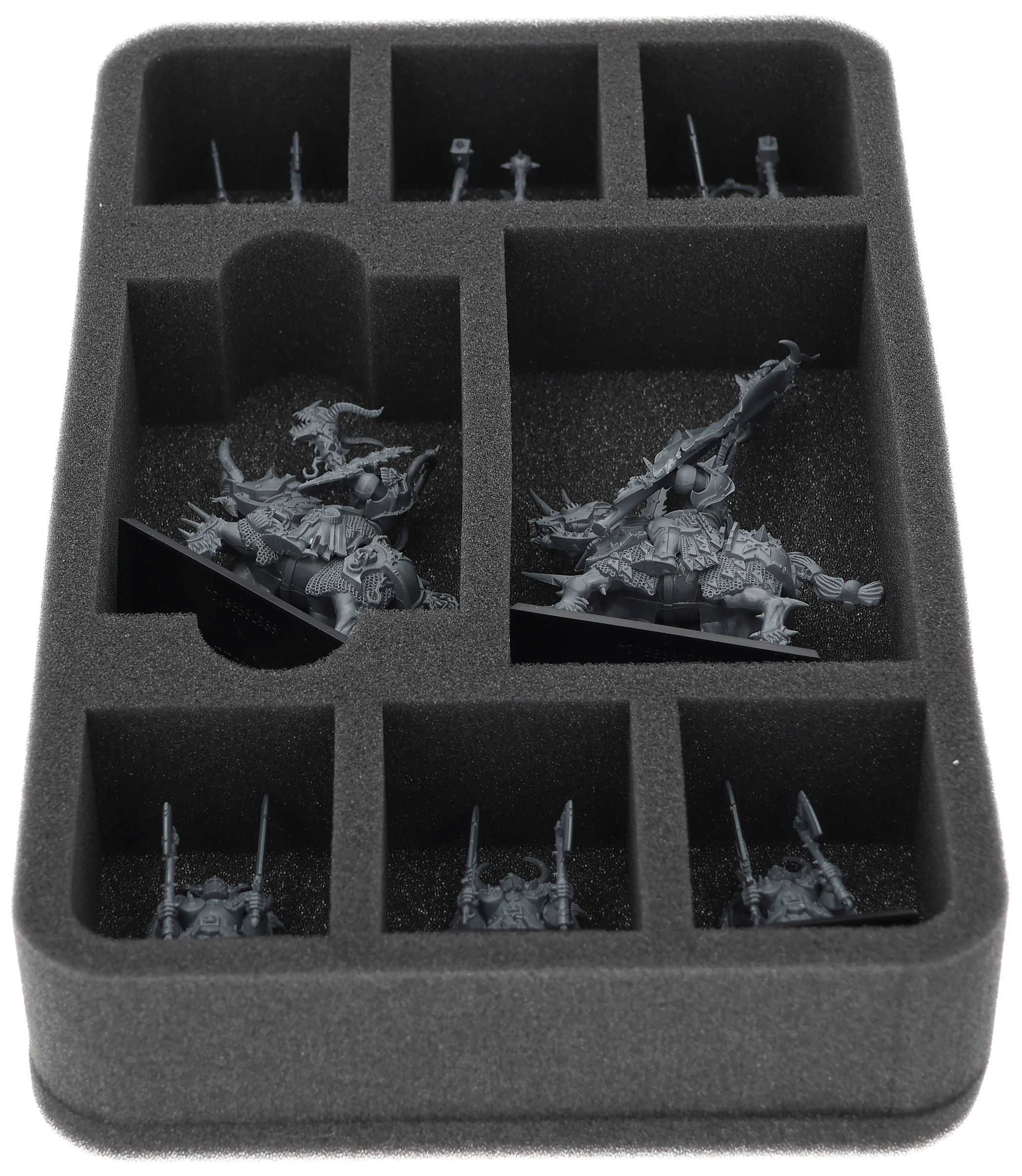 On this Feldherr foam tray you have space for up to 8 miniatures of your army. The insert is especially suitable for storing the Marauder Horseman, Chaos Marauders, Chaos Knights, Chaos Warriors and similar sized models.
