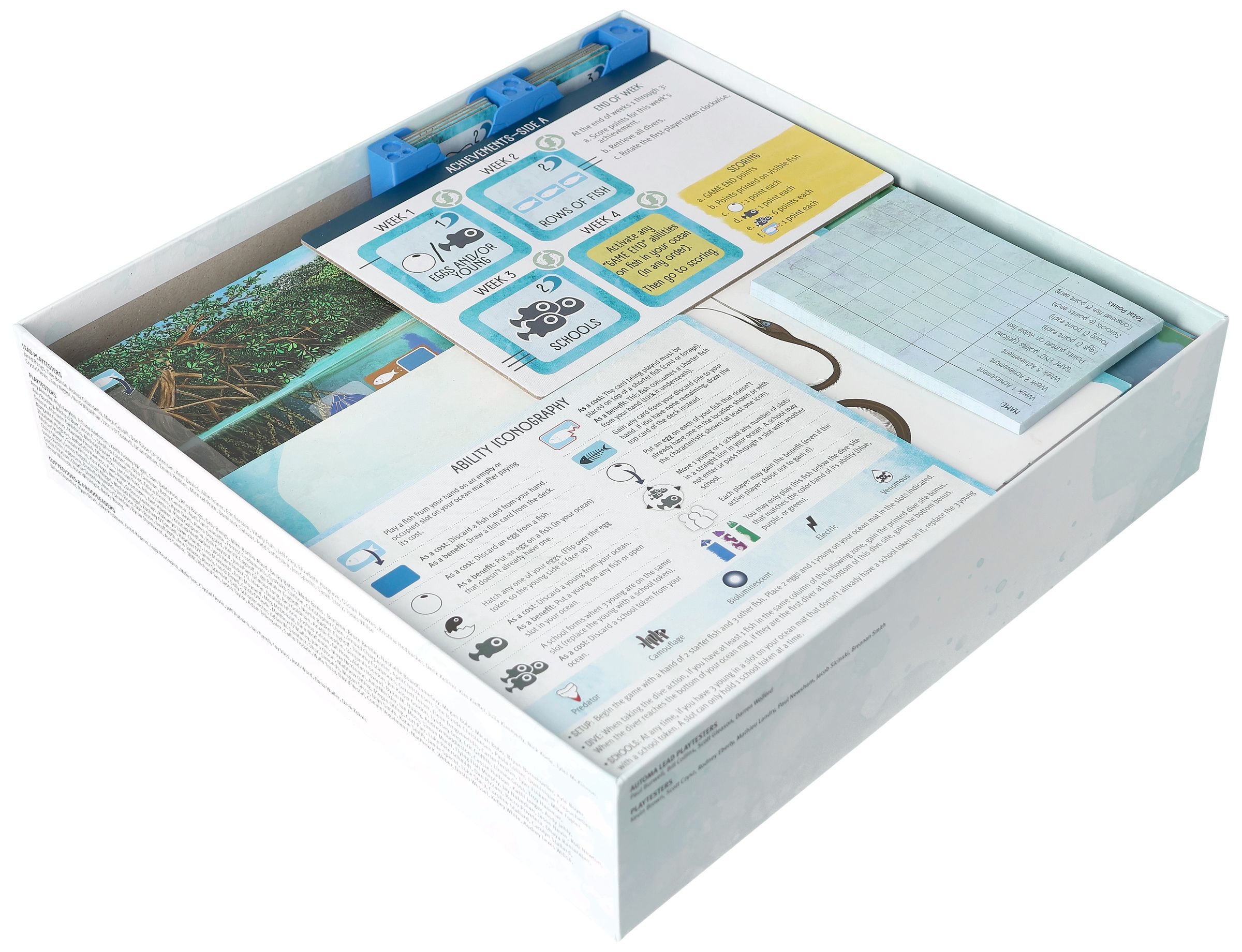 - Achievement Boards, Ocean Mats, Scorepad, Player Aids, and rulebook are safely stored on top of the organizer - nothing slips thanks to the 3D holder and access slot.