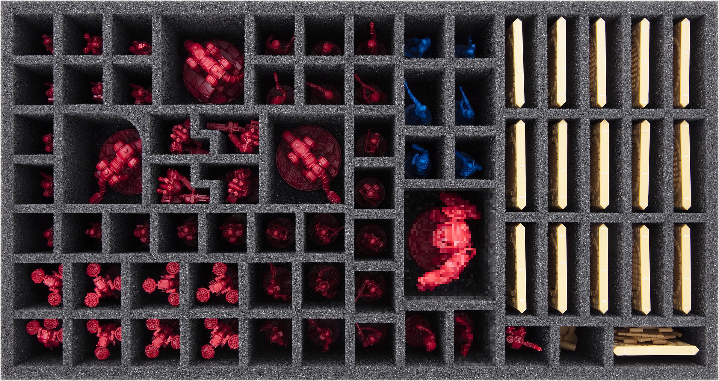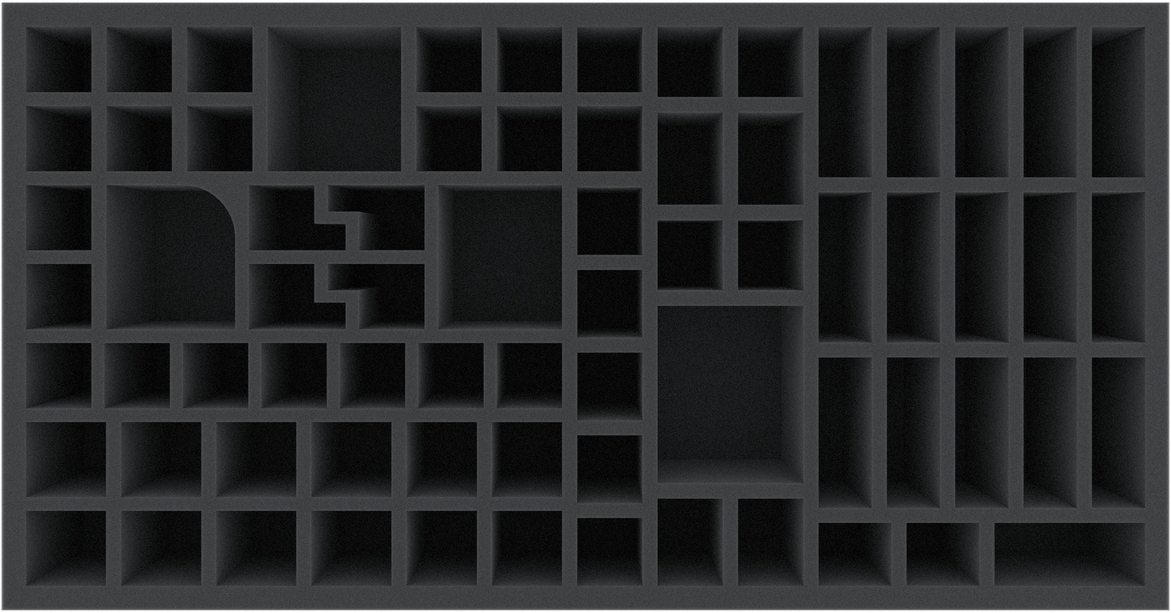 - 1 Feldherr foam tray with 68 compartments for plastic miniatures like hero, enemy, and boss models, barricades, and doors (FBMFIG070BO)