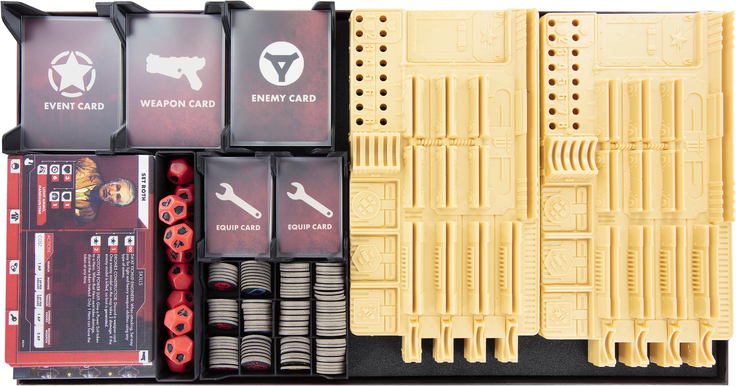 - 3 plastic card holders, each with a compartment for standard cards like enemy cards, event cards, weapon cards