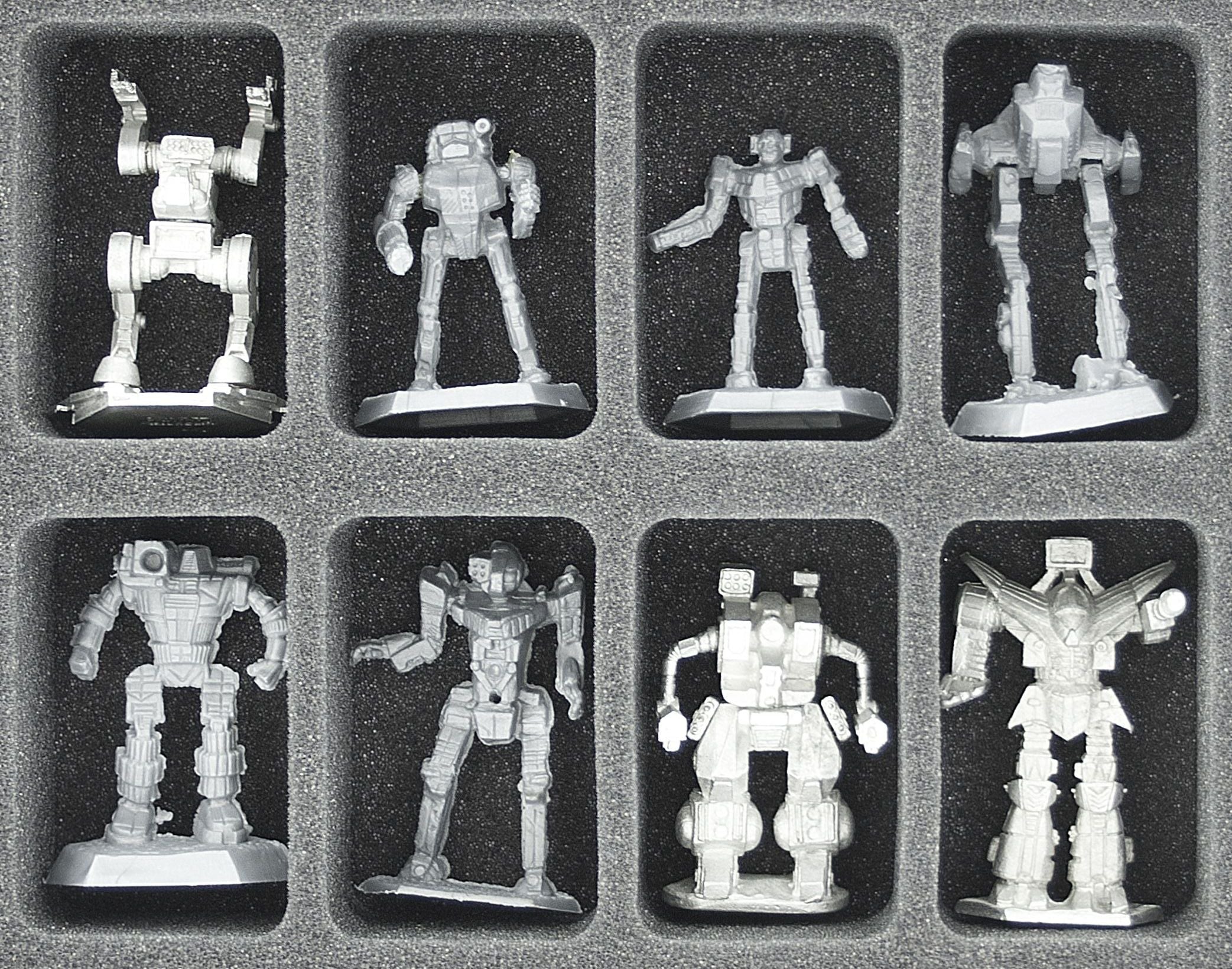 The 2 foam trays with 10 compartments each are suitable for large Mechs and will hold up to 4 lances including accessories.